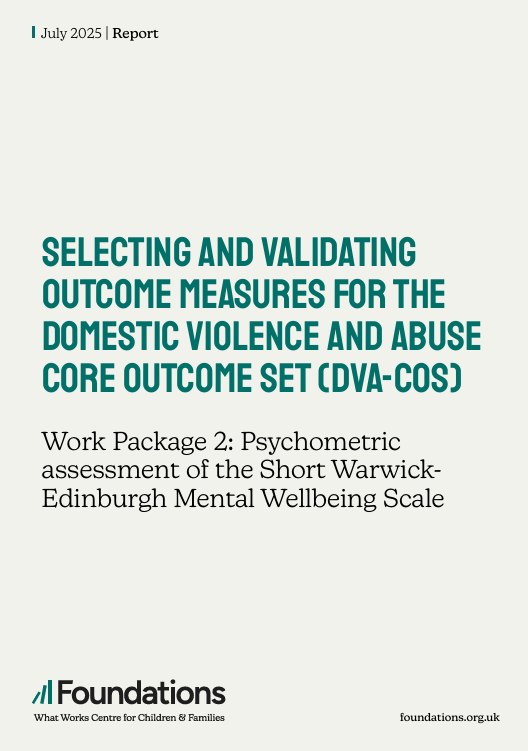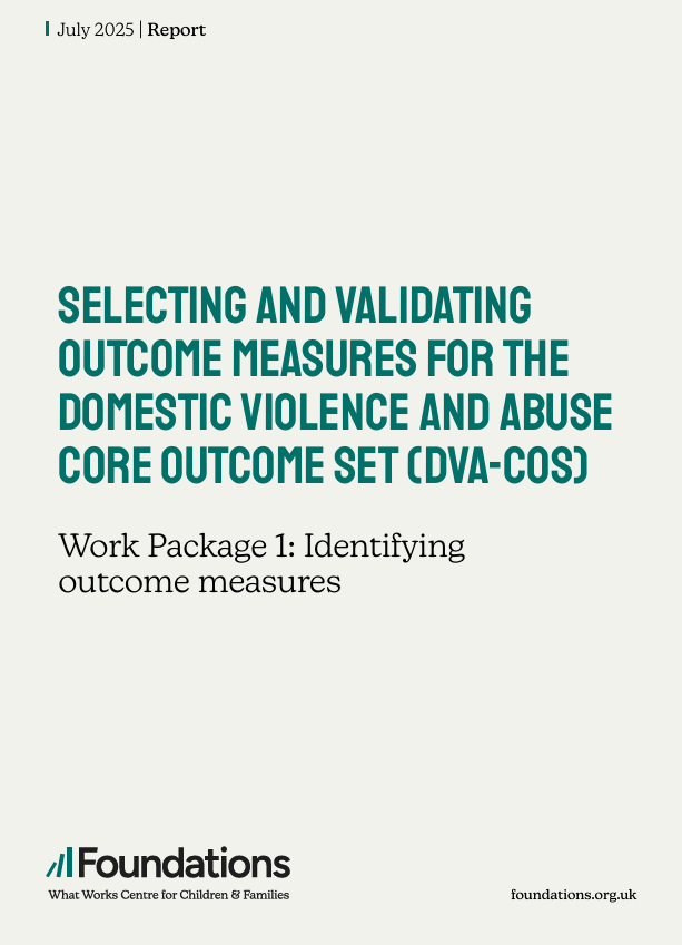 Background - The domestic violence and abuse core outcome set (DVA-COS) is an agreed set of five outcomes intended for use in evaluating interventions for children and their families with experience of domestic abuse. The purpose of a core outcome set is to harmonise outcome measurement, helping to reduce variation in outcome selection and measurement across studies, with the aim of preventing research waste. This minimum, but not exclusive, set of outcomes also aims to ensure interventions capture impact meaningful to all stakeholders, whether through routine data collection within domestic abuse services or as outcomes in trials and research evaluations. Since the development of the DVA-COS, work has been undertaken to consolidate and validate outcome measurement instruments (OMIs) to use within the core outcome set. The work reported here builds on and extends these efforts (Powell, Clark, et al., 2022; Powell, Feder, et al., 2022). Aims Foundations, the national What Works Centre for Children & Families, commissioned a programme of work, comprised of two work packages, to develop and validate OMIs for use in the DVA-COS. This report focuses on work package 1, which sought to identify and appraise measurement tools, using the COnsensus-based Standards for the selection of health Measurement INstruments (COSMIN) Process, to assess three of the five core outcomes of the DVA-COS: family relationships, feelings of safety, and freedom to go about daily life. Work package 2 sought to validate the Short Warwick–Edinburgh Mental Wellbeing Scale (SWEMWBS) for use with child and young people populations with experience of domestic abuse and is reported separately. Methods To meet the aim of work package 1, this project adopted a four-stage process. Within stage A, OMIs were identified through rapid reviews of the domestic abuse literature (peer-reviewed and grey) and through targeted searches of the non-domestic abuse literature; these searches were informed by concept workshops with 15 key stakeholders to highlight priority concepts within the outcomes. In stage B, candidate OMIs and their associated studies were quality appraised, using the COSMIN protocol, and the highest-scoring tools were shortlisted for assessment of their acceptability and feasibility. Feedback workshops and stakeholder votes, held within stage C, determined which tools should proceed to the consensus workshop. Concluding this process (stage D), a consensus workshop was held with 29 domestic abuse practitioners, commissioners, researchers, and survivors to allow stakeholders to discuss and reach agreement on recommending OMIs for the three outcomes. Key findings In total 144 OMIs were identified across all evidence sources and from previous work. A systematic process of conceptual mapping, quality appraisal, and examination of acceptability and feasibility issues resulted in a shortlist of 18 OMIs (seven OMIs mapping to family relationships, six mapping to feelings of safety, and five capturing freedom to go about daily life) for discussion by three stakeholder groups. Of these, eight OMIs (three OMIs for family relationships, three for feelings of safety, and two for freedom to go about daily life) progressed to the final consensus workshop. Votes held during the consensus workshop identified the Children and Families Against Domestic Abuse (CAFADA) Wellbeing and Safety as the preferred OMI to assess two outcomes: family relationships (81.5%) and feelings of safety (74.1%). A provisional recommendation for use of this tool was agreed, given that it was recently developed and so it lacks psychometric validation. Therefore it is recommended that before widespread use, this OMI is subject to further adaptation and evaluation in cooperation with the tool developers. In particular, thought is needed about the tool’s suitability for a wider range of interventions, including those supporting perinatal families or services including the person that harms. No agreement, and therefore no recommendation, was reached for an OMI capturing freedom to go about daily life. Feedback from the consensus workshop highlighted a range of positive attributes that explained the CAFADA Wellbeing and Safety’s high acceptability for use within domestic abuse contexts, such as visually appealing design, trauma-informed and strengths-based language, and the complementary adult and child versions. The consensus workshop also highlighted key areas of development such as removing gendered language, being inclusive of non-traditional family structures, and being accessible to children of different ages or cognitive maturity. Conclusion This work makes important strides towards the realisation of a DVA-COS. It establishes a consensus with respect to the provisional recommendation for use of the CAFADA Wellbeing and Safety scale, in research and practice contexts, to assess feelings of safety and family relationships. This provisional recommendation is dependent on further work being carried out to refine the tool and to evaluate its implementation in real-world contexts and in relation to different types of childand family-focused interventions. The not insignificant challenges of implementing a core outcome set are discussed, including the importance of creating trauma-informed guidance to ensure the DVA-COS adopts a care-first approach and to mitigate any unintended consequences. Key findings In total 144 OMIs were identified across all evidence sources and from previous work. A systematic process of conceptual mapping, quality appraisal, and examination of acceptability and feasibility issues resulted in a shortlist of 18 OMIs (seven OMIs mapping to family relationships, six mapping to feelings of safety, and five capturing freedom to go about daily life) for discussion by three stakeholder groups. Of these, eight OMIs (three OMIs for family relationships, three for feelings of safety, and two for freedom to go about daily life) progressed to t
