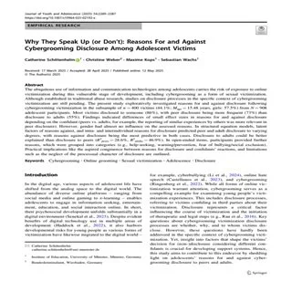 The ubiquitous use of information and communication technologies among adolescents carries the risk of exposure to online victimization during this vulnerable stage of development, including cybergrooming as a form of sexual victimization. Although established in traditional abuse research, studies on disclosure processes in the specific context of cybergrooming victimization are still pending. The present study exploratively investigated reasons for and against disclosure following cybergrooming victimization in the subsample of n = 400 victims (44.1%; Mage = 15.48 years, girls: 57.5%) from N = 908 adolescent participants. Most victims disclosed to someone (86%), with peer disclosure being more frequent (73%) than disclosure to adults (55%). Findings indicated differences of small effect sizes in reasons for and against disclosure depending on the confidant (peers vs. adults; for example, the reporting of similar experiences by others was more relevant in peer disclosure). However, gender had almost no influence on the assessed reasons. In structural equation models, latent factors of reasons against, and intra- and interindividual reasons for disclosure predicted peer and adult disclosure to varying degrees, with reasons against disclosure being the most predictive in both cases. Disclosure to adults could be better explained than disclosure to peers (R2 peers = 28.6%, R2 adults = 46.9%). In open-ended items, participants provided further reasons, which were grouped into categories (e.g., help-seeking, warning/prevention, fear of bullying/social exclusion). Practical implications like the aspired congruence between reasons for disclosure and confidants’ reactions, and limitations such as the neglect of the processual character of disclosure are outlined.