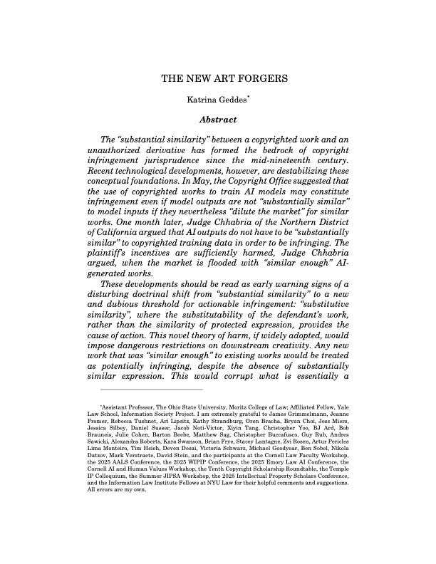 The “substantial similarity” between a copyrighted work and an unauthorized derivative has formed the bedrock of copyright infringement jurisprudence since the mid-nineteenth century. Recent technological developments, however, are destabilizing these conceptual foundations. In May, the Copyright Office suggested that the use of copyrighted works to train AI models may constitute infringement even if model outputs are not “substantially similar” to model inputs if they nevertheless “dilute the market” for similar works. One month later, Judge Chhabria of the Northern District of California argued that AI outputs do not have to be “substantially similar” to copyrighted training data in order to be infringing. The plaintiff’s incentives are sufficiently harmed, Judge Chhabria argued, when the market is flooded with “similar enough” AI-generated works.