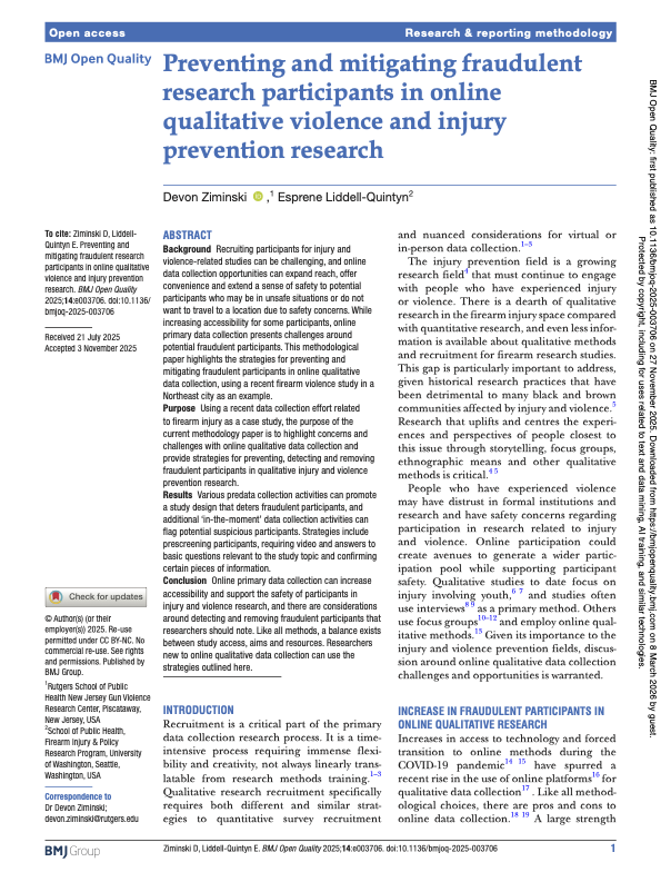 Recruiting participants for injury and violence-related studies can be challenging, and online data collection opportunities can expand reach, offer convenience and extend a sense of safety to potential participants who may be in unsafe situations or do not want to travel to a location due to safety concerns. While increasing accessibility for some participants, online primary data collection presents challenges around potential fraudulent participants. This methodological paper highlights the strategies for preventing and mitigating fraudulent participants in online qualitative data collection, using a recent firearm violence study in a Northeast city as an example. Purpose Using a recent data collection effort related to firearm injury as a case study, the purpose of the current methodology paper is to highlight concerns and challenges with online qualitative data collection and provide strategies for preventing, detecting and removing fraudulent participants in qualitative injury and violence prevention research.Results Various predata collection activities can promote a study design that deters fraudulent participants, and additional ‘in-the-moment’ data collection activities can flag potential suspicious participants. Strategies include prescreening participants, requiring video and answers to basic questions relevant to the study topic and confirming certain pieces of information. Conclusion Online primary data collection can increase accessibility and support the safety of participants in injury and violence research, and there are considerations around detecting and removing fraudulent participants that researchers should note. Like all methods, a balance exists between study access, aims and resources. Researchers new to online qualitative data collection can use the strategies outlined here.