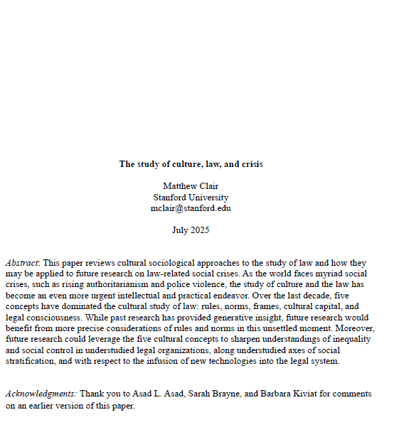Abstract: This paper reviews cultural sociological approaches to the study of law and how they may be applied to future research on law-related social crises. As the world faces myriad social crises, such as rising authoritarianism and police violence, the study of culture and the law has become an even more urgent intellectual and practical endeavor. Over the last decade, five concepts have dominated the cultural study of law: rules, norms, frames, cultural capital, and legal consciousness. While past research has provided generative insight, future research would benefit from more precise considerations of rules and norms in this unsettled moment. Moreover, future research could leverage the five cultural concepts to sharpen understandings of inequality and social control in understudied legal organizations, along understudied axes of social stratification, and with respect to the infusion of new technologies into the legal system.