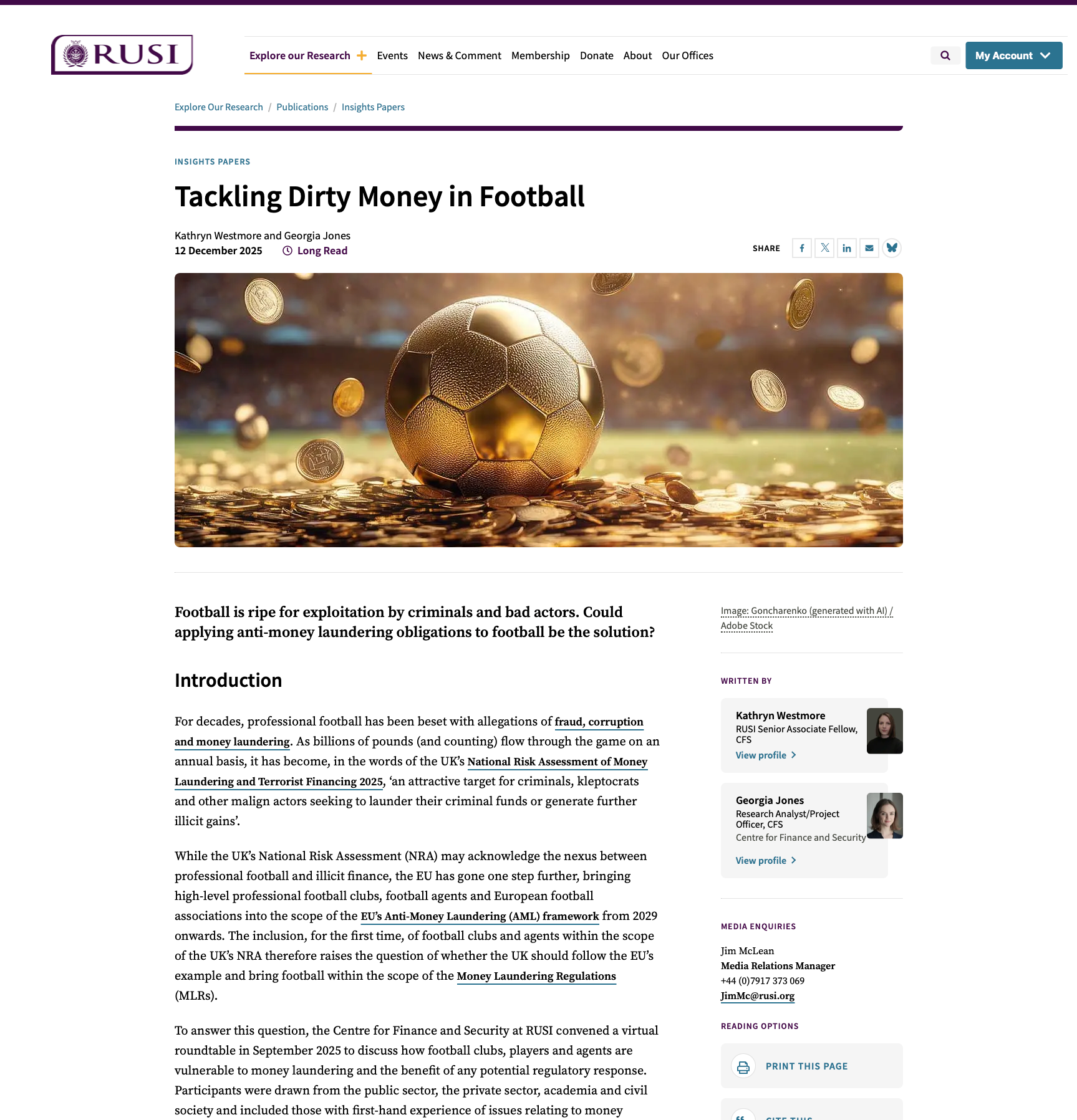 To answer this question, the Centre for Finance and Security at RUSI convened a virtual roundtable in September 2025 to discuss how football clubs, players and agents are vulnerable to money laundering and the benefit of any potential regulatory response. Participants were drawn from the public sector, the private sector, academia and civil society and included those with first-hand experience of issues relating to money laundering, financial crime and compliance within professional sports.