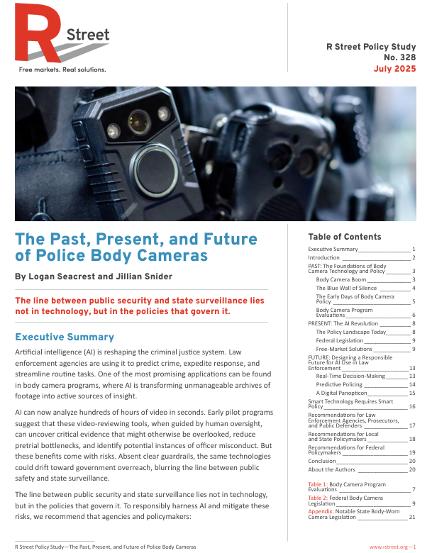 Artificial intelligence (AI) is reshaping the criminal justice system. Law enforcement agencies are using it to predict crime, expedite response, and streamline routine tasks. One of the most promising applications can be found in body camera programs, where AI is transforming unmanageable archives of footage into active sources of insight. AI can now analyze hundreds of hours of video in seconds. Early pilot programs suggest that these video-reviewing tools, when guided by human oversight, can uncover critical evidence that might otherwise be overlooked, reduce pretrial bottlenecks, and identify potential instances of officer misconduct. But these benefits come with risks. Absent clear guardrails, the same technologies could drift toward government overreach, blurring the line between public safety and state surveillance. The line between public security and state surveillance lies not in technology, but in the policies that govern it. To responsibly harness AI and mitigate these risks, we recommend that agencies and policymakers: • Establish and enforce clear use policies. Statewide rules for body camera use and AI governance ensure consistency across jurisdictions, particularly in areas like body camera activation, evidence sharing, and public disclosure. • Pair technology with human oversight. AI should enhance—not replace—human decision-making. Final judgments must rest with trained personnel, supported by independent policy oversight from civilian review boards. • Safeguard civil liberties. Safeguards must be in place to protect individual rights, limit surveillance overreach, and ensure data transparency. For example, limiting facial recognition during constitutionally protected activities like protests will help ensure AI is aligned with democratic ideals. With the right guardrails in place, AI can elevate body cameras from afteraction archival tools to always-on intelligence tools, informing decisions in the moment, when it matters most.