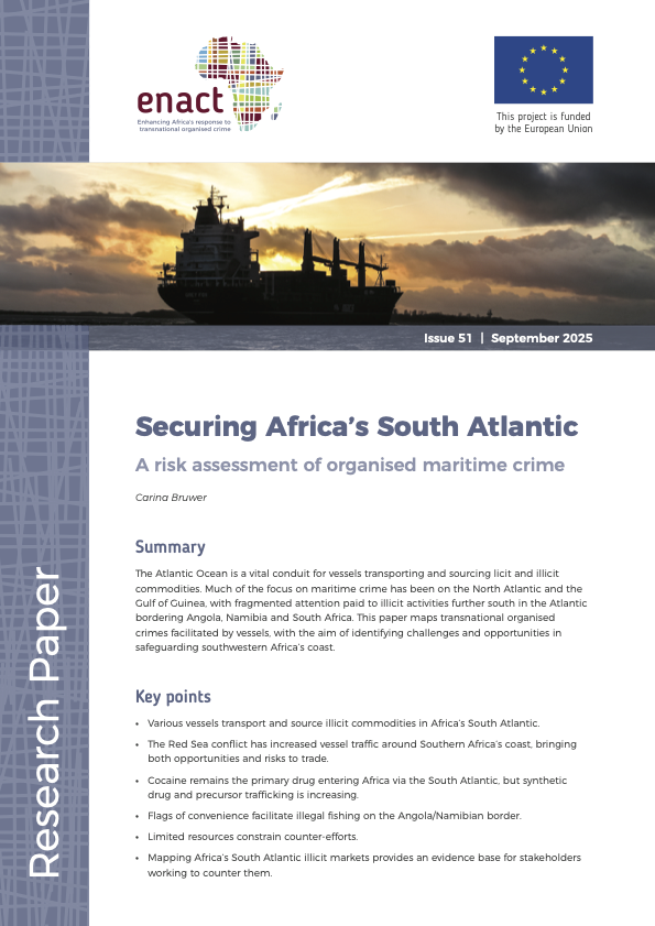 The Atlantic Ocean is a vital conduit for vessels transporting and sourcing licit and illicit commodities. Much of the focus on maritime crime has been on the North Atlantic and the Gulf of Guinea, with fragmented attention paid to illicit activities further south in the Atlantic bordering Angola, Namibia and South Africa. This paper maps transnational organised crimes facilitated by vessels, with the aim of identifying challenges and opportunities in safeguarding southwestern Africa’s coast. Key points • Various vessels transport and source illicit commodities in Africa’s South Atlantic. • The Red Sea conflict has increased vessel traffic around Southern Africa’s coast, bringing both opportunities and risks to trade. • Cocaine remains the primary drug entering Africa via the South Atlantic, but synthetic drug and precursor trafficking is increasing. • Flags of convenience facilitate illegal fishing on the Angola/Namibian border. • Limited resources constrain counter-efforts. • Mapping Africa’s South Atlantic illicit markets provides an evidence base for stakeholders working to counter them.