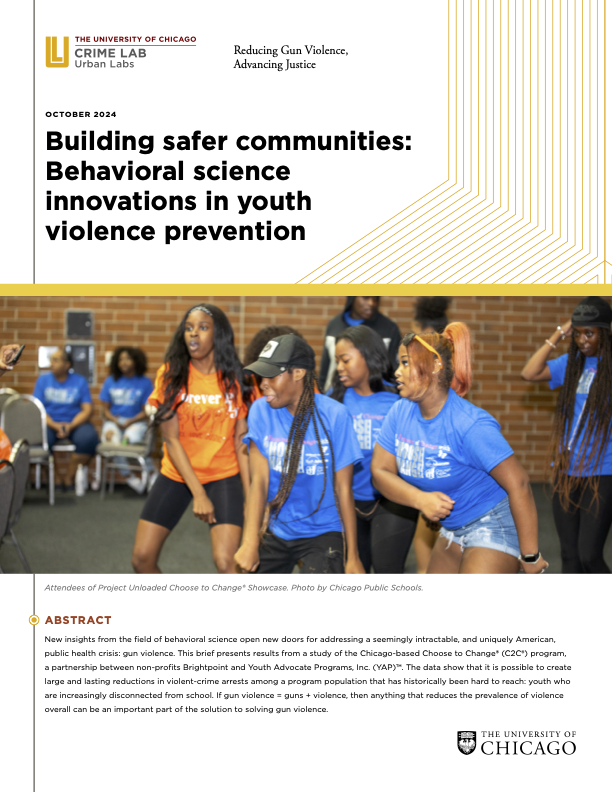 New insights from the field of behavioral science open new doors for addressing a seemingly intractable, and uniquely American, public health crisis: gun violence. This brief presents results from a study of the Chicago-based Choose to Change® (C2C®) program, a partnership between non-profits Brightpoint and Youth Advocate Programs, Inc. (YAP)™. The data show that it is possible to create large and lasting reductions in violent-crime arrests among a program population that has historically been hard to reach: youth who are increasingly disconnected from school. If gun violence = guns + violence, then anything that reduces the prevalence of violence overall can be an important part of the solution to solving gun violence.