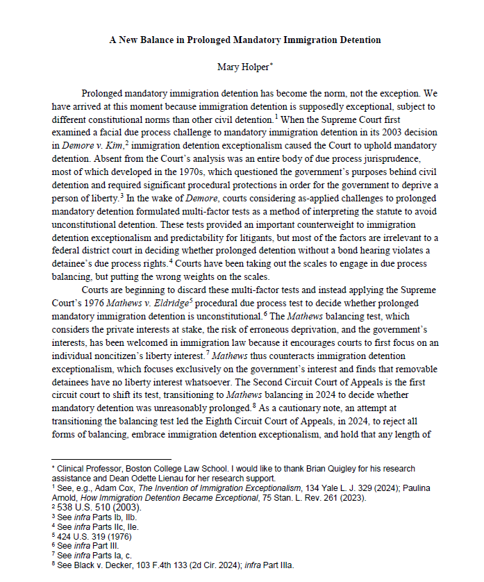 Courts are beginning to discard these multi-factor tests and instead applying the Supreme Court's 1976 Mathews v. Eldridge procedural due process test to decide whether prolonged mandatory immigration detention is unconstitutional. The Mathews balancing test, which considers the private interests at stake, the risk of erroneous deprivation, and the government's interests, has been welcomed in immigration law because it encourages courts to first focus on an individual noncitizen's liberty interest. Mathews thus counteracts immigration detention exceptionalism, which focuses exclusively on the government's interest and finds that removable detainees have no liberty interest whatsoever. The Second Circuit Court of Appeals is the first circuit court to shift its test, transitioning to Mathews balancing in 2024 to decide whether mandatory detention was unreasonably prolonged. As a cautionary note, an attempt at transitioning the balancing test led the Eighth Circuit Court of Appeals, in 2024, to reject all forms of balancing, embrace immigration detention exceptionalism, and hold that any length of mandatory detention is acceptable during removal proceedings. This Article argues that courts can make prolonged mandatory immigration detention exceptional by continuing the work of the Second Circuit in applying the Mathews procedural due process balancing test instead of the existing multi-factor tests.