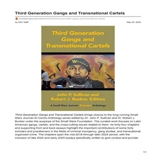 Third Generation Gangs and Transnational Cartels brings closure to the long running Small Wars Journal–El Centro Anthology series edited by Dr. John P. Sullivan and Dr. Robert J. Bunker under the auspices of the Small Wars Foundation. The curated work focuses on Latin American gangs, cartels, and the cross-cutting issues related to them. Its forty-four chapters and supporting front and back essays highlight the important contributions of some forty scholars and practitioners in the fields of criminal insurgency, gang studies, and transnational organized crime. The chapters span the mid-2018 through later-2024 period, with the inclusion of late 2024 and early 2025 essays specifically written to give context and provide analysis related to this work. The anthology benefits from a Foreword provided by Dr. Rashmi Singh, an Afterword offered by Dr. Alexandra Phelan, and a Postscript written by Dr. Mahmut Cengiz.