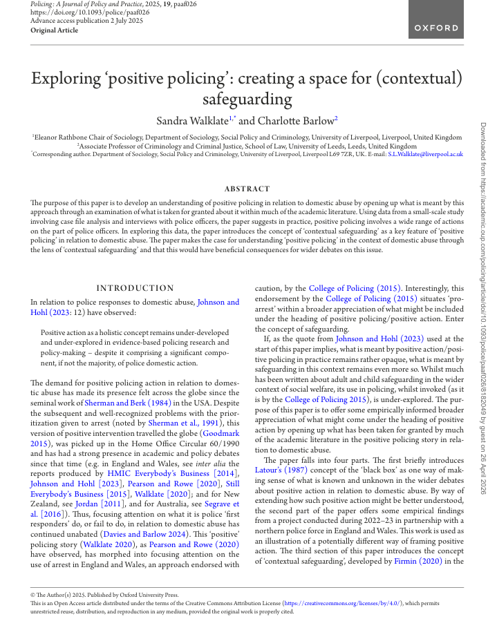 The purpose of this paper is to develop an understanding of positive policing in relation to domestic abuse by opening up what is meant by this approach through an examination of what is taken for granted about it within much of the academic literature. Using data from a small-scale study involving case file analysis and interviews with police officers, the paper suggests in practice, positive policing involves a wide range of actions on the part of police officers. In exploring this data, the paper introduces the concept of ‘contextual safeguarding’ as a key feature of ‘positive policing’ in relation to domestic abuse. The paper makes the case for understanding ‘positive policing’ in the context of domestic abuse through the lens of ‘contextual safeguarding’ and that this would have beneficial consequences for wider debates on this issue.