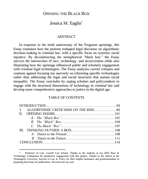 In response to the tenth anniversary of the Ferguson uprisings, this Essay examines how the protests reshaped legal discourse on algorithmic decision-making in criminal law, with a specific focus on systemic racial injustice. By deconstructing the metaphorical “black box,” the Essay surveys the intersection of race, technology, and incarceration while also illustrating how the uprisings influenced public and scholarly engagement with criminal legal technologies. The Essay analyzes current critiques and cautions against focusing too narrowly on reforming specific technologies rather than addressing the legal and social structures that sustain racial inequality. The Essay concludes by urging scholars and policymakers to engage with the structural dimensions of technology in criminal law and develop more comprehensive approaches to justice in the digital age.