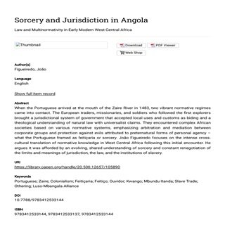 When the Portuguese arrived at the mouth of the Zaire River in 1483, two vibrant normative regimes came into contact. The European traders, missionaries, and soldiers who followed the first explorers brought a jurisdictional system of government that accepted local uses and customs as biding and a theological understanding of natural law with universalist claims. They encountered complex African societies based on various normative systems, emphasizing arbitration and mediation between corporate groups and protection against evils attributed to preternatural forms of personal agency – what the Portuguese framed as feitiçaria or sorcery. João Figueiredo focuses on the intense cross-cultural translation of normative knowledge in West Central Africa following this initial encounter. He argues it was afforded by an evolving, shared understanding of sorcery and constant renegotiation of the limits and meanings of jurisdiction, the law, and the institutions of slavery.