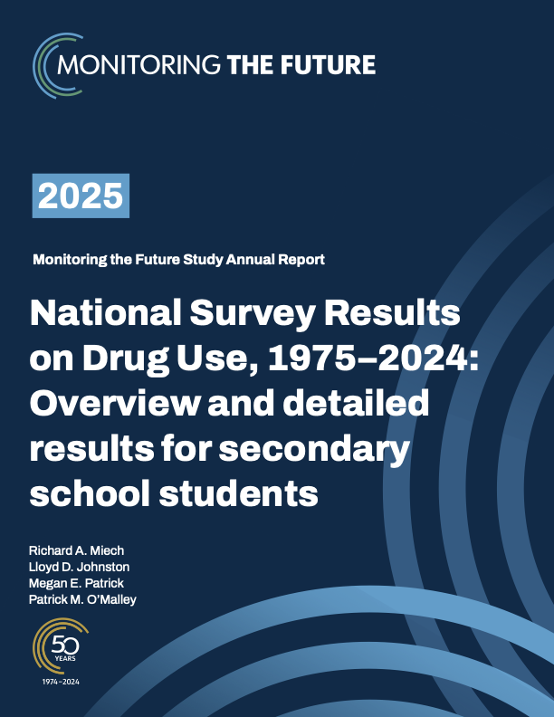 Substance use is a leading cause of preventable morbidity and mortality; it is in large part why, among 17 high-income nations, people in the United States have the highest probability of dying by age 50.1,2,3 Substance use is also an important contributor to many social problems including domestic violence, violence more generally, criminal behavior, suicide, and more—and it is typically initiated during adolescence. It warrants our sustained attention. Monitoring the Future (MTF) is designed to give such attention to substance use among the nation’s youth and adults. It is an investigator-initiated study that originated with, and is conducted by, teams of research professors at the University of Michigan’s Institute for Social Research. Since its onset in 1975, MTF has been funded continuously by the National Institute on Drug Abuse—one of the National Institutes of Health—under a series of peer reviewed, competitive research grants. The 2024 survey, reported here, is the 50th consecutive national survey of 12th grade students and the 34th national survey of 8th and 10th grade students (who were added to the study in 1991). MTF contains ongoing national surveys of both adolescents and adults in the United States. It provides the nation with a vital window into the important but often hidden problem behaviors of use of illegal drugs, alcohol, tobacco, and psychotherapeutic drugs used without a doctor’s orders. For nearly five decades, MTF has helped provide a clearer view of the changing topography of these problems among adolescents and adults, a better understanding of the dynamic factors that drive some of these problems, and a better understanding of some of their consequences. It has also given policymakers, government agencies, public health professionals, and nongovernmental organizations (NGOs) in the field some practical approaches for intervening. A widespread epidemic of illicit drug use emerged in the 1960s among U.S. youth, and since then dramatic changes have occurred in the use of nearly all types of illicit drugs as well as alcohol and tobacco. Of particular importance, as discussed in detail below, are the many new illicit drugs that have emerged, along with new forms of alcoholic beverages and nicotine products. Among the substances and devices that have emerged over the life of the survey are new classes of drugs that include vaping devices, hookah smoking, synthetic marijuana, and drugs taken for performance enhancement. New devices and methods for taking drugs, such as vaporizers and e-cigarettes,number of new substances added to the list over the years substantially outnumbers the number removed because so many substances remain in active use. Throughout these many changes, substance use among the nation’s youth has remained a major concern for parents, educators, health professionals, law enforcement, and policymakers, largely because substance misuse is one of the largest and yet most preventable causes of morbidity and mortality during and after adolescence. The MTF annual monograph series is a key vehicle for disseminating MTF’s epidemiological findings. In addition to this monograph, the series includes a separate, annual monograph that presents prevalence and trends among U.S. adults now ages 19 to 65, including both college students and their age peers who are not attending college (scheduled for publication this summer), as well as an additional, periodic monograph that presents information on risk and protective behaviors for HIV among young adults. All MTF publications, including press releases, are available on the project website at www.monitoringthefuture.org