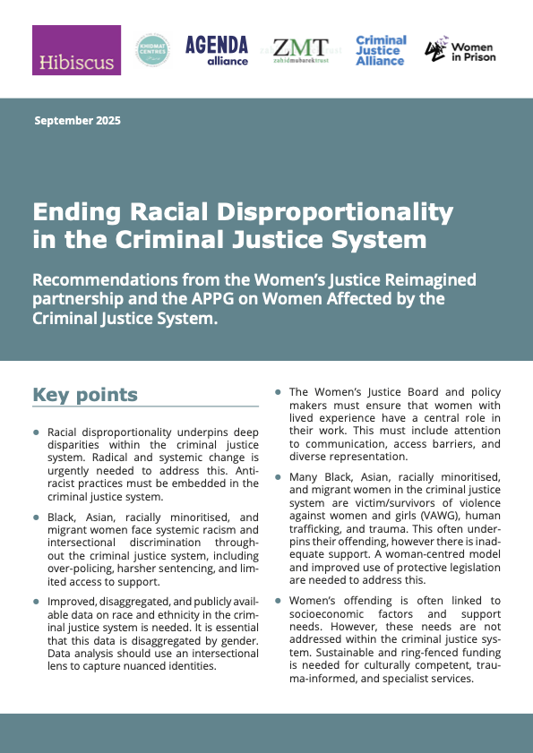 Key points • Racial disproportionality underpins deep disparities within the criminal justice system. Radical and systemic change is urgently needed to address this. Antiracist practices must be embedded in the criminal justice system. • Black, Asian, racially minoritised, and migrant women face systemic racism and intersectional discrimination throughout the criminal justice system, including over-policing, harsher sentencing, and limited access to support. • Improved, disaggregated, and publicly available data on race and ethnicity in the criminal justice system is needed. It is essential that this data is disaggregated by gender. Data analysis should use an intersectional lens to capture nuanced identities.• The Women’s Justice Board and policy makers must ensure that women with lived experience have a central role in their work. This must include attention to communication, access barriers, and diverse representation. • Many Black, Asian, racially minoritised, and migrant women in the criminal justice system are victim/survivors of violence against women and girls (VAWG), human trafficking, and trauma. This often underpins their offending, however there is inadequate support. A woman-centred model and improved use of protective legislation are needed to address this. • Women’s offending is often linked to socioeconomic factors and support needs. However, these needs are not addressed within the criminal justice system. Sustainable and ring-fenced funding is needed for culturally competent, trauma-informed, and specialist services.