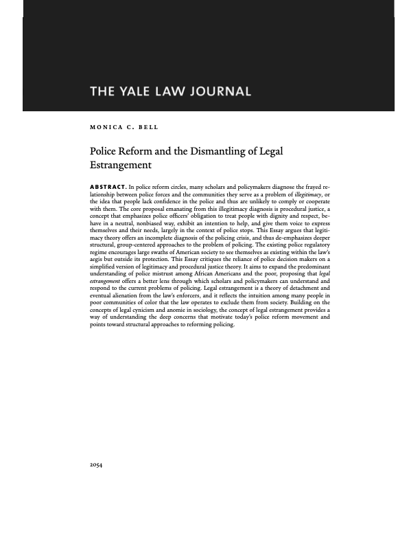 By Monica C. Bell In police reform circles, many scholars and policymakers diagnose the frayed relationship between police forces and the communities they serve as a problem of illegitimacy, or the idea that people lack confidence in the police and thus are unlikely to comply or cooperate with them. The core proposal emanating from this illegitimacy diagnosis is procedural justice, a concept that emphasizes police officers’ obligation to treat people with dignity and respect, behave in a neutral, nonbiased way, exhibit an intention to help, and give them voice to express themselves and their needs, largely in the context of police stops. This Essay argues that legitimacy theory offers an incomplete diagnosis of the policing crisis, and thus de-emphasizes deeper structural, group-centered approaches to the problem of policing. The existing police regulatory regime encourages large swaths of American society to see themselves as existing within the law’s aegis but outside its protection. This Essay critiques the reliance of police decision makers on a simplified version of legitimacy and procedural justice theory. It aims to expand the predominant understanding of police mistrust among African Americans and the poor, proposing that legal estrangement offers a better lens through which scholars and policymakers can understand and respond to the current problems of policing. Legal estrangement is a theory of detachment and eventual alienation from the law’s enforcers, and it reflects the intuition among many people in poor communities of color that the law operates to exclude them from society. Building on the concepts of legal cynicism and anomie in sociology, the concept of legal estrangement provides a way of understanding the deep concerns that motivate today’s police reform movement and points toward structural approaches to reforming policing.