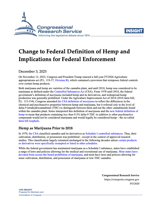 On November 12, 2025, Congress and President Trump enacted a full-year FY2026 Agriculture appropriations act (P.L. 119-37, Division B), which contained a provision that reimposes federal controls over certain hemp products.