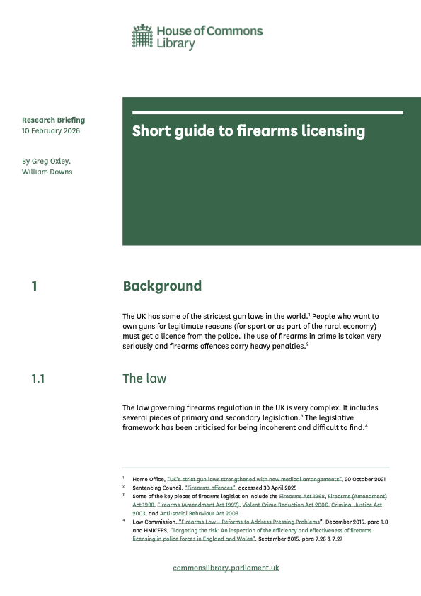 The UK has some of the strictest gun laws in the world. People who want to own guns for legitimate reasons (for sport or as part of the rural economy) must get a licence from the police. The use of firearms in crime is taken very seriously and firearms offences carry heavy penalties.The law on firearmsThe law governing firearms regulation in the UK is very complex. It includes several pieces of primary and secondary legislation. The legislative framework has been criticised for being incoherent and difficult to find.The Law Commission (the independent body responsible for reviewing the law) published a review of firearms law in 2015 and recommended it be codified so that the legislation is clear, consistent and can be understood by ordinary people. It also recommended several key terms be defined by new legislation. Part 6 of the Policing and Crime Act 2017 went some way to implementing the Law Commission’s recommendations to define key terms but stopped short of codifying the law.The Home Office maintains a collection of resources relating to firearms licensing, including the Statutory guidance for police on firearms licensing which helps police chiefs carry out checks when assessing someone’s suitability to own firearms or become a registered firearms dealer and the Home Office guide to firearms licensing law which is designed to educate the police, gun owners and the public about firearms law.