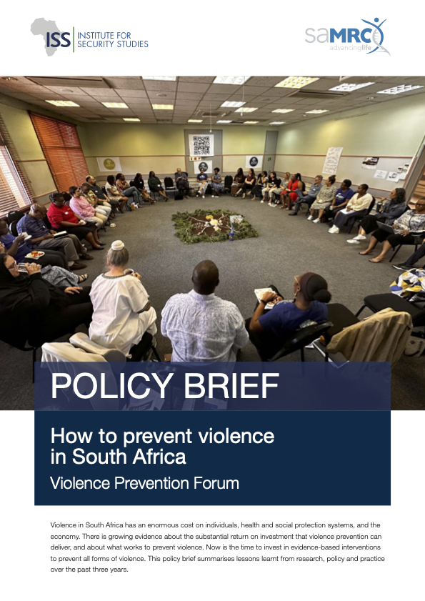 Violence in South Africa has an enormous cost on individuals, health and social protection systems, and the economy. There is growing evidence about the substantial return on investment that violence prevention can deliver, and about what works to prevent violence. Now is the time to invest in evidence-based interventions to prevent all forms of violence. This policy brief summarises lessons learnt from research, policy and practice over the past three years. Key findings Violence costs the economy, companies, and health and social systems. There is evidence for a positive return on investments when violence is prevented. This means it is cheaper to fund effective violence prevention than a criminal justice system, which reacts to violent crime. There is a growing body of research and practicebased knowledge of what works to prevent violence in South Africa. There is a strong association between violence and inequality, unemployment, food insecurity and poverty. Parenting and community-based interventions show significant effects on preventing or reducing intimate partner violence and violence against children. With regard to violence against women: The chances of getting justice for a murdered woman are low and decreasing. Police fail to make arrests despite an intimate partner or family member being involved in more than 70% of cases. Experience of trauma and poor mental health increase the chances of women students in higher education institutions being targeted for sexual violence. Circumstances that lead male students to perpetrate violence include abuse during childhood, and cultural norms equating masculinity with dominance over women. Burnout and exhaustion in frontline workers significantly hamper violence prevention efforts