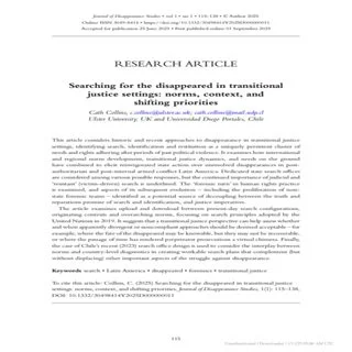 The article examines upload and download between present-day search configurations, originating contexts and overarching norms, focusing on search principles adopted by the United Nations in 2019. It suggests that a transitional justice perspective can help assess whether and when apparently divergent or noncompliant approaches should be deemed acceptable – for example, where the fate of the disappeared may be knowable, but they may not be recoverable, or where the passage of time has rendered perpetrator prosecutions a virtual chimera. Finally, the case of Chile’s recent (2023) search office design is used to consider the interplay between norms and country-level diagnostics in creating workable search plans that complement (but without displacing) other important aspects of the struggle against disappearance.