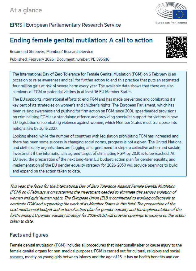 The International Day of Zero Tolerance for Female Genital Mutilation (FGM) on 6 February is an occasion to raise awareness and call for further action to end this practice that puts an estimated four million girls at risk of severe harm every year. The available data shows that there are also survivors of FGM or potential victims in at least 16 EU Member States. The EU supports international efforts to end FGM and has made preventing and combating it a key part of its strategies on women's and children's rights. The European Parliament, which has been raising awareness and pushing for firm action on FGM since 2001, spearheaded provisions on criminalising FGM as a standalone offence and providing specialist support for victims in new EU legislation on combating violence against women, which Member States must transpose into national law by June 2027. Looking ahead, while the number of countries with legislation prohibiting FGM has increased and there has been some success in changing social norms, progress is not a given. The United Nations and civil society organisations are flagging an urgent need to step up collective action and sustain investment if the internationally agreed target of eliminating FGM by 2030 is to be reached. At EU level, the preparation of the next long-term EU budget, action plan for gender equality, and implementation of the EU gender equality strategy for 2026-2030 will provide openings to build and expand on the action taken to date.