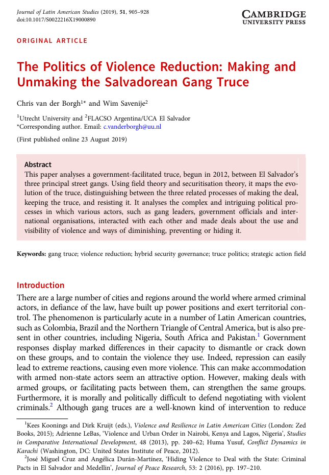 This paper analyses a government-facilitated truce, begun in 2012, between El Salvador’s three principal street gangs. Using field theory and securitisation theory, it maps the evolution of the truce, distinguishing between the three related processes of making the deal, keeping the truce, and resisting it. It analyses the complex and intriguing political processes in which various actors, such as gang leaders, government officials and international organisations, interacted with each other and made deals about the use and visibility of violence and ways of diminishing, preventing or hiding it.