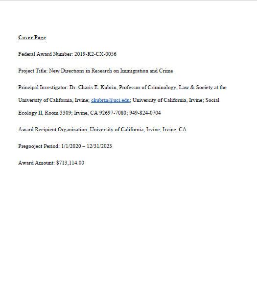 The main objective of the project is to improve understanding of the immigration-crime relationship by addressing several important areas of inquiry. These areas of inquiry represent key omissions in the literature that merit attention. For example, next to no research has examined the robustness of the immigration-crime relationship across a substantially large and diverse range of neighborhoods across the U.S., which reflect different immigration contexts and histories. At the same time, with few exceptions, research largely lumps all immigrants together and neglects important differences across groups, whether by immigrant status or demographic or socio-economic background. Finally, little is known about how the immigration-crime relationship may be context dependent, and how immigration-related policies and practices may condition the immigration-crime relationship. Using data from a variety of sources over many years (2000-2016), we conduct a series of analyses that refine and advance our understanding of the immigration-crime relationship. These analyses address a variety of research questions including: How robust is the immigration-crime relationship? What are the appropriate ways to capture varied effects of immigrant groups on neighborhood crime rates? Does citizenship status matter? How do levels of assimilation impact how immigration and crime are associated? Which immigrant groups have crime reducing effects in neighborhoods? Which have crime enhancing effects? Another set of analyses consider the extent to which the broader city-context of reception as well as immigration-related policies and practices condition the immigration-crime relationship. These analyses address research questions including: Which city-level characteristics matter most for impacting the neighborhood immigration-crime relationship? How does immigration enforcement condition the relationship between immigration and crime? Do “sanctuary cities” attract crime-prone immigrants, reducing public safety overall? To achieve these goals and begin to answer these research questions, we collected, cleaned and merged data from many sources including crime data from police departments, public use Census and American Community Survey data, restricted data from the Census Data Center at UC Irvine, historical business data from Reference USA, and TRACFed data, among others. After considerable effort, we collected data for a sample of 415 cities in 2020 with at least 10,000 population, a sample of 480 cities in 2010, a sample of 168 cities in 2000, a subset of 310 cities with longitudinal data in 2010 and 2018, and a subset of 139 cities with longitudinal data in 2000 and 2010. No comparable neighborhood crime data set that covers such a large and diverse range of contexts currently exists. (continued)