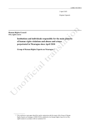 A. Background 1. Pursuant to its resolution 49/3, the Human Rights Council established the Group of Human Rights Experts on Nicaragua, to investigate alleged human rights violations and abuses committed in Nicaragua since April 2018 and provide guidance on justice and accountability. In its resolution 52/2, the Council extended the mandate of the Group for a period of two years. The Group is composed of Jan-Michael Simon (Chair), Ariela Peralta Distéfano and Reed Brody. 2. The Group has previously concluded that there were reasonable grounds to believe that, since April 2018, State and non-State actors had committed serious human rights violations and abuses against an ever-growing range of real or perceived opponents and their relatives in a systematic and widespread manner. 1 The Group determined that some of those violations constituted, prima facie, the crimes against humanity of murder, imprisonment, torture, including rape and other forms of sexual violence of comparable gravity, deportation and persecution. 3. The present conference room paper, which complements the report submitted to the Human Rights Council (A/HRC/58/26), contains the detailed findings of the Group of Experts on the structure of the repressive State, chains of command and State and individual responsibilities in relation to the main patterns of violations and abuses documented since the beginning of its mandate. Ten functional diagrams illustrating the de jure and de facto connections between different State and non-State entities are available on the Group’s web page. 2 4. The present document identifies individuals whom the Group of Experts has reasonable grounds to believe are responsible for violations, abuses and crimes. A list of these names was sent to the Government of Nicaragua to give the identified individuals an opportunity to respond to the allegations made against them. The Group recalls that while the threshold of "reasonable grounds to believe" is lower than that required to establish responsibility in criminal proceedings, it is sufficient to justify the initiation of investigations (see section I(C)(3) below). While that threshold does not preclude the identification in the present conference room paper of possible individual responsibilities, determinations about individual criminal responsibility can be made only by competent judicial authorities with full respect for the right to a fair trial of the accused. 5. Despite the Council's calls upon the Government of Nicaragua to cooperate fully with the Group, including by granting it unfettered access to the whole country, the Government continues to refuse to engage with the Group. Since the beginning of its mandate, the Group has sent 17 unanswered letters to the Nicaraguan authorities requesting information. 3 On 27 February 2025, the Government of Nicaragua announced its withdrawal from the Human Rights Council and all its subsidiary mechanisms. 4 6. On 26 March 2025, the Human Rights Council decided to postpone consideration of the adoption of the outcome document of the Universal Periodic Review of Nicaragua, fourth cycle, scheduled for the 58th session of the Human Rights Council. This decision was taken as Nicaragua's positions on the recommendations received on 13 November 2024 during the Review were not received. The Human Rights Council decided to call on the Government of Review were not received. The Human Rights Council decided to call on the Government of Nicaragua to resume its cooperation and to schedule the consideration of the outcome document of the Universal Periodic Review at its 60th session.5 7. Despite the lack of cooperation and elevated security risks for victims, witnesses and others providing information, the Group was able to gather, analyse and corroborate the information and evidence necessary to establish the facts of, and prima facie responsibility for,the serious violations, abuses and crimes described in the present conference room paper.