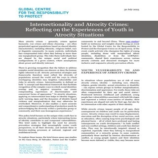 The brief draws on case studies from the Gaza Strip, El Salvador, Sudan and the Uyghur community in and beyond China. These examples are informed by testimony and insights shared by youth activists during an event hosted by the Global Centre for the Responsibility to Protect and the European Union on 18 April 2024. Participants included young advocates for marginalized ethnic groups, people with disabilities and LGBTQIA+ youth, who shared their lived experiences and strategies for more inclusive, effective prevention.