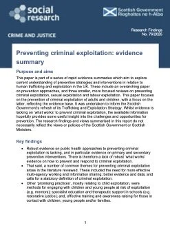 This paper is part of a series of rapid evidence summaries which aim to explore current understanding of prevention strategies and interventions in relation to human trafficking and exploitation in the UK. These include an overarching paper on prevention approaches, and three smaller, more focused reviews on preventing criminal exploitation, sexual exploitation and labour exploitation. This paper focuses on the prevention of criminal exploitation of adults and children, with a focus on the latter, reflecting the evidence base. It was undertaken to inform the Scottish Government’s refresh of its Trafficking and Exploitation Strategy. Whilst evidence is lacking on ‘what works’ to prevent criminal exploitation, the available information hopefully provides some useful insight into the challenges and opportunities for prevention. The research findings and views summarised in this report do not necessarily reflect the views or policies of the Scottish Government or Scottish Ministers.