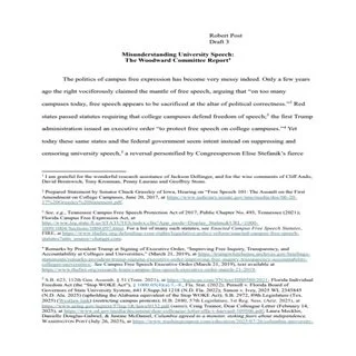 This article argues that the Woodward Report fundamentally confuses freedom of speech and academic freedom. In the American constitutional tradition, freedom of speech is a speaker-oriented right whose purpose is to ensure that “authority . . . is to be controlled by public opinion, not public opinion by authority.” Because the First Amendment stands as the guardian of American democracy, every person enjoys an equal constitutional right to participate in the formation of public opinion. For First Amendment purposes, speech is the medium within which self-government transpires, and so content and viewpoint discrimination is forbidden.