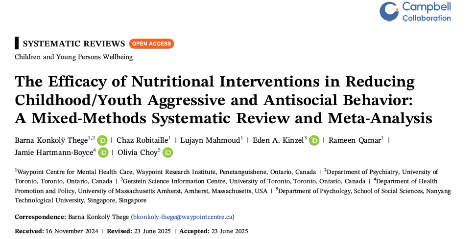 Aggressive/antisocial behaviors in children and youth may result in impairments in family, social, or academic functioning and lead to long‐term negative consequences for both the individual and society as a whole. The potential of healthy diet and nutritional supplements to reduce aggression and antisocial behavior is an active area of study in nutritional mental health sciences. The goal of this systematic review is to (1) investigate the effectiveness/efficacy of nutritional interventions(dietary manipulation, fortification or supplementation) in reducing excessive aggression, antisocial behaviors, and criminal offending in children/youth (systematic review and meta‐analysis); and (2) provide an overview of implementation barriers and facilitators regarding nutritional interventions in children/youth (qualitative/narrative synthesis). After consulting theCampbell Collaboration's methodological guidelines, a comprehensive search for published and unpublished papers on controlled intervention studies was performed (up to February 26, 2024) using both electronic databases (MEDLINE,Embase, Cochrane Library, APA PsycInfo, Scopus, and the Allied and Complementary Medicine Database) and other resources (e.g., Google Scholar, reference list of included studies and other reviews, websites of public health agencies). This study focuses on children and youth (up to the age of 24) presenting with an above‐average level of aggression/antisocial behavior. In terms of the intervention, we considered both dietary manipulation and nutritional supplementation with aduration long enough (minimum of 1 week) that a significant change in the individual's nutritional status could be expected.We included studies with a controlled design if, for outcomes, they reported on (1) behavioral‐level violence/aggression toward others in real‐life (non‐simulated) settings, (2) antisocial behaviors, or (3) criminal offending. Initial screening,checking for eligibility criteria, data extraction from, and risk of bias assessment for each eligible study were conducted independently by two reviewers. To perform the meta‐analysis, data from each original report were standardized(transformed into Hedges' g) so that results across studies could be meaningfully combined and interpreted. Data con-versions, computation of pooled effect sizes, and estimation of publication bias were conducted using the ComprehensiveMeta‐analysis software (Version 4). Altogether, 51 reports (describing 50 individual studies) met our inclusion criteria, and72 effect sizes were extracted from these reports. Nutritional interventions with a broad target (e.g., broad‐spectrummicronutrient supplementation or general improvement in diet quality) had the most consistent and largest intervention