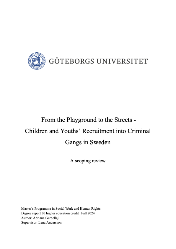 Key findings are that gangs are very accessible to children as they often are located in disadvantaged neighborhoods, parents’ lack of support, school systems lack of resources to children who need extra help and friends creating peer pressure for children to join gangs. The effects of children in gangs are both psychological and physical, social workers are involved by trying to steer away children and youth from getting associated with gangs and from international insights it is known that children should be offered school and recreational activities. Conclusions drawn are that the issue of criminal gangs could have its roots from the segregations created by the Million project, where thousands of apartments were built during a short timespan, and that these disadvantaged neighborhoods have with time gotten heightened crime rates, as gangs expand and start to include children. The children are severely affected socially, psychologically and physically due to the gang presence, something social workers together with other actors such as the police and school can take collaborative measures to prevent by offering children a positive alternative.