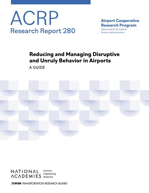 ACRP Research Report 280: Reducing and Managing Disruptive and Unruly Behavior in Airports: A Guide, from TRB's Airport Cooperative Research Program, presents a practical guide for reducing and responding to incidents of disruptive, threatening, or violent behavior in an airport setting. The guide examines the topic holistically and offers a structured approach to understanding root causes, prevention and mitigation strategies, coordinated response, and post incident analysis.