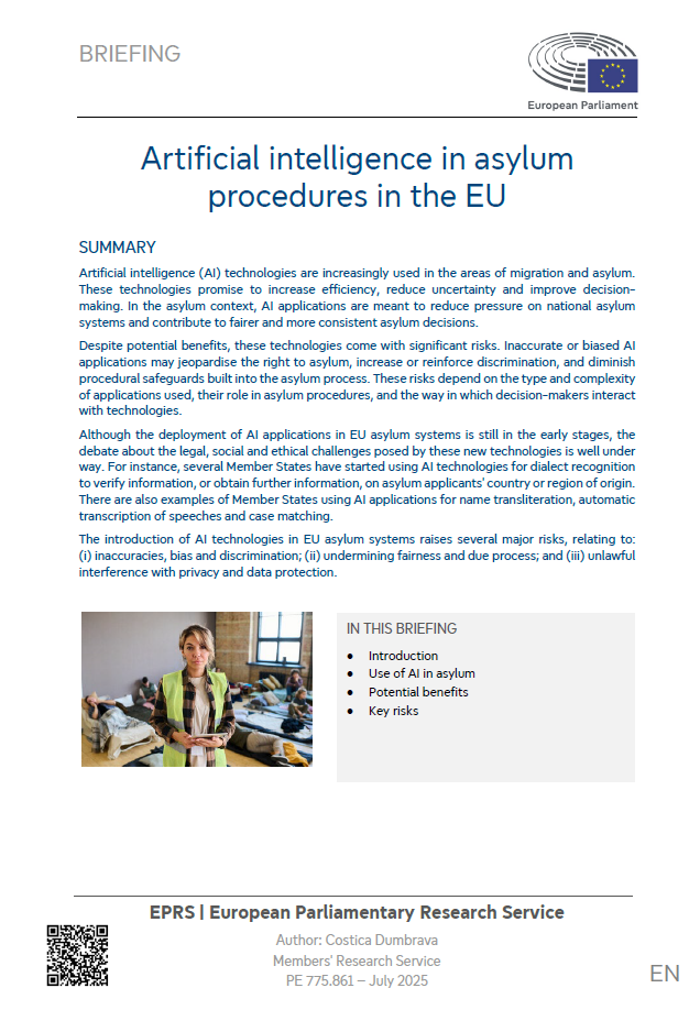 Artificial intelligence (AI) technologies are increasingly used in the areas of migration and asylum. These technologies promise to increase efficiency, reduce uncertainty and improve decision-making. In the asylum context, AI applications are meant to reduce pressure on national asylum systems and contribute to fairer and more consistent asylum decisions. Despite potential benefits, these technologies come with significant risks. Inaccurate or biased AI applications may jeopardise the right to asylum, increase or reinforce discrimination, and diminish procedural safeguards built into the asylum process. These risks depend on the type and complexity of applications used, their role in asylum procedures, and the way in which decision-makers interact with technologies. Although the deployment of AI applications in EU asylum systems is still in the early stages, the debate about the legal, social and ethical challenges posed by these new technologies is well under way. For instance, several Member States have started using AI technologies for dialect recognition to verify information, or obtain further information, on asylum applicants' country or region of origin. There are also examples of Member States using AI applications for name transliteration, automatic transcription of speeches and case matching. The introduction of AI technologies in EU asylum systems raises several major risks, relating to: (i) inaccuracies, bias and discrimination; (ii) undermining fairness and due process; and (iii) unlawful interference with privacy and data protection.