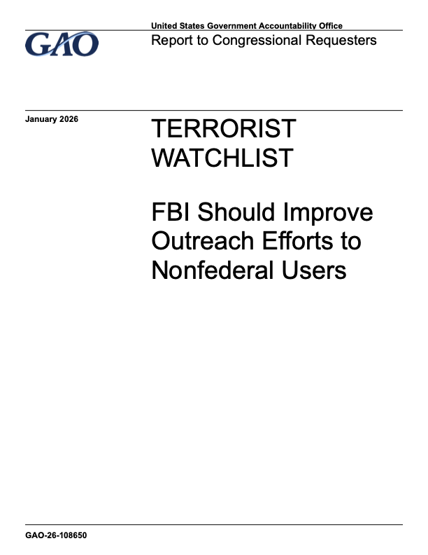 Why GAO Did This Study The Threat Screening Center, administered by FBI, is responsible for managing the terrorist watchlist. In recent years, Members of Congress have raised questions about how nonfederal entities use the terrorist watchlist. GAO was asked to examine the use of the terrorist watchlist by nonfederal law enforcement entities. This report examines (1) nonfederal entities’ reporting of terrorist watchlist encounters to FBI and opportunities for improvement and (2) steps FBI has taken to ensure nonfederal entities’ awareness of watchlist policies through outreach and state-led trainings. GAO reviewed watchlist policies and training resources for nonfederal entities and collected encounter data for fiscal years 2019 through 2024. GAO interviewed nonfederal law enforcement officials in four states selected based on the number of encounters and other factors. While not generalizable, these interviews provided insights into officials’ awareness of policies and training. This is the public version of a sensitive report GAO issued in August 2025. Information on encounter data and official FBI instructions on handling watchlist encounters that FBI deemed sensitive has been omitted.What GAO Recommends GAO recommends that FBI (1) seek information to understand the extent to which nonfederal law enforcement entities are consistently reporting terrorist watchlist encounters, (2) develop a communication plan to improve its outreach efforts, and (3) develop a process to review state efforts to instruct NCIC users about watchlist policies. FBI concurred with the recommendations.